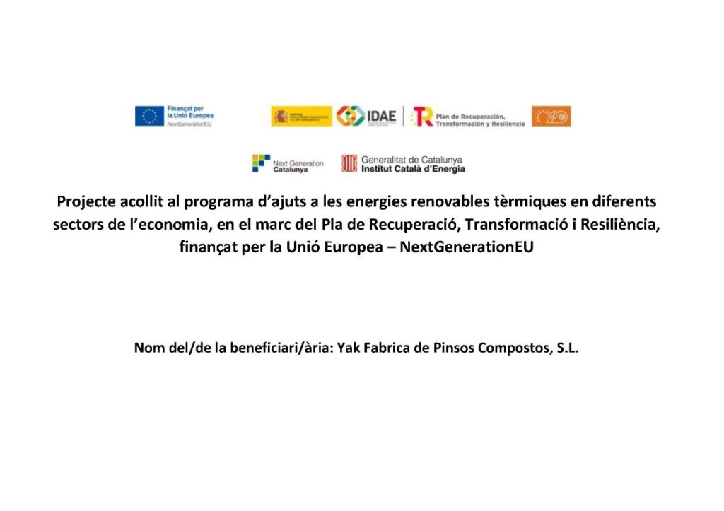 YAK FABRICA DE PINSOS COMPOSTOS, S.L. ha rebut una ajuda per al seu projecte d'una caldera de biomassa, “Instal·lació de caldera de BIOMASSA a les instal·lacions de YAK FÀBRICA DE PINSOS COMPOSTOS SL” cofinançada pel Mecanisme Europeu de Recuperació i Resiliència PRTR-Next Generation EU, coordinada pel Ministeri per a la Transició Ecològica i el Repte Demogràfic mitjançant IDAE i gestionada per les autonomies segons el RD 1124/2021, amb l'objectiu d'aconseguir una economia més neta i sostenible. S´ha elaborat un projecte d´implementació d´energies renovables, consistent en una instal·lació d´una caldera de biomassa de 200 kW.